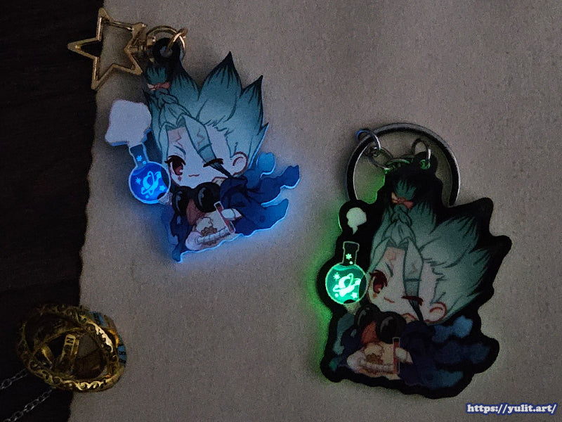 Professional printed acrylic keychain featuring Alchemist Senku with mysterious glow in the dark patterns.