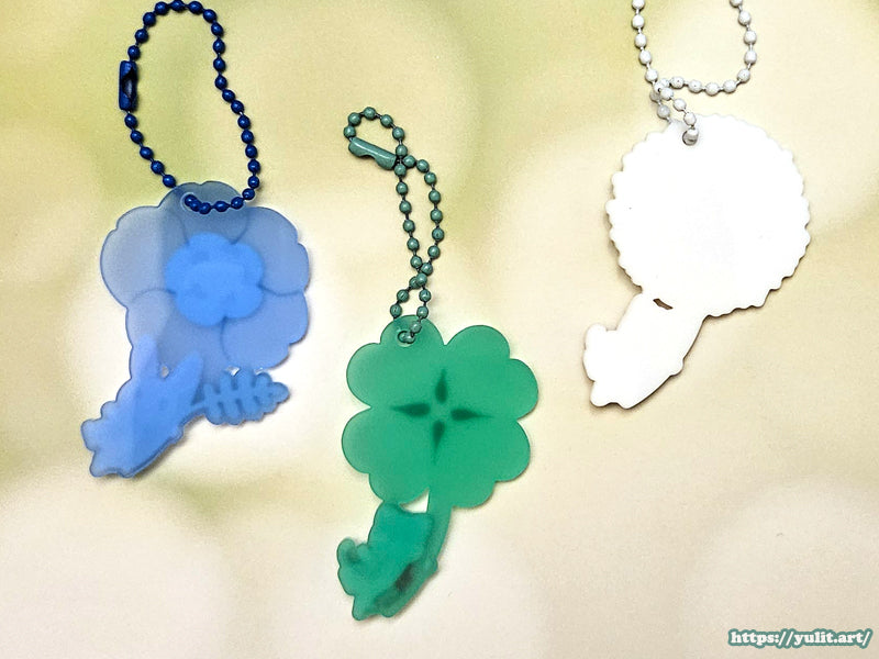 Keychains made of frosted acrylic featuring bunnies and cats floating with plants.