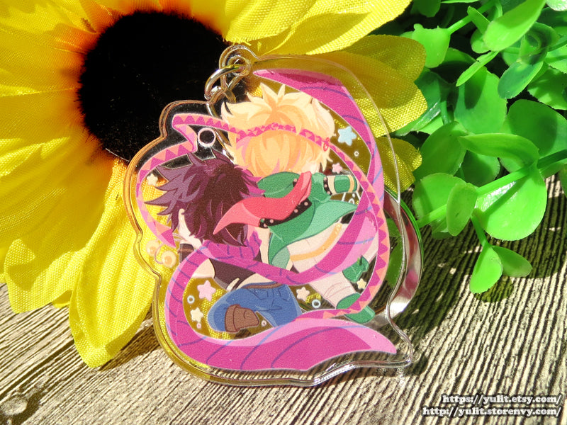 Double-sided professionally printed high gloss clear acrylic keychain featuring 2 different Images of the characters (front and back).