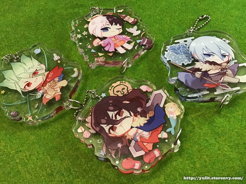 Super thick 8mm high gloss acrylic keychains featuring Senku, Gen, Tsukasa, and Hyoga!