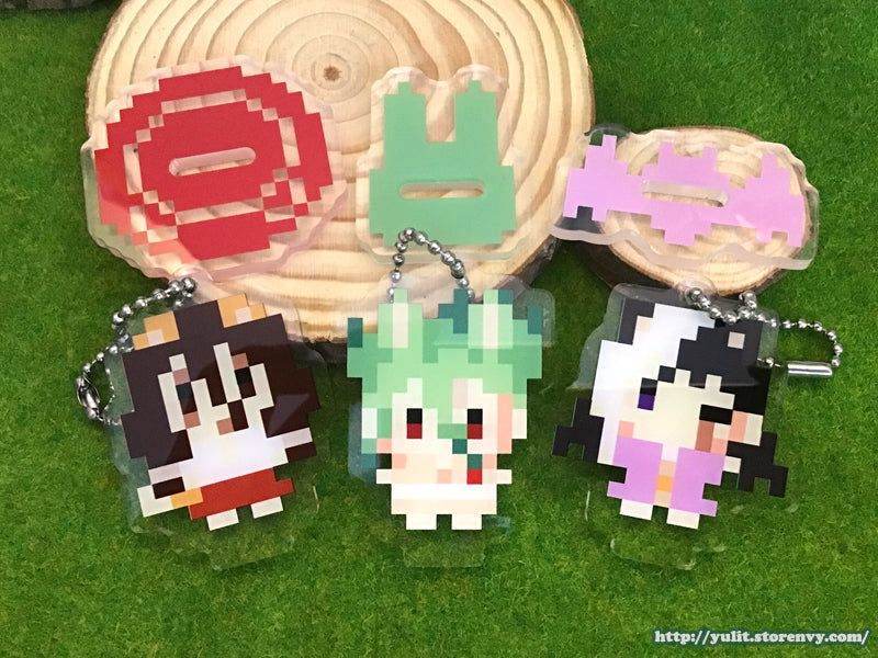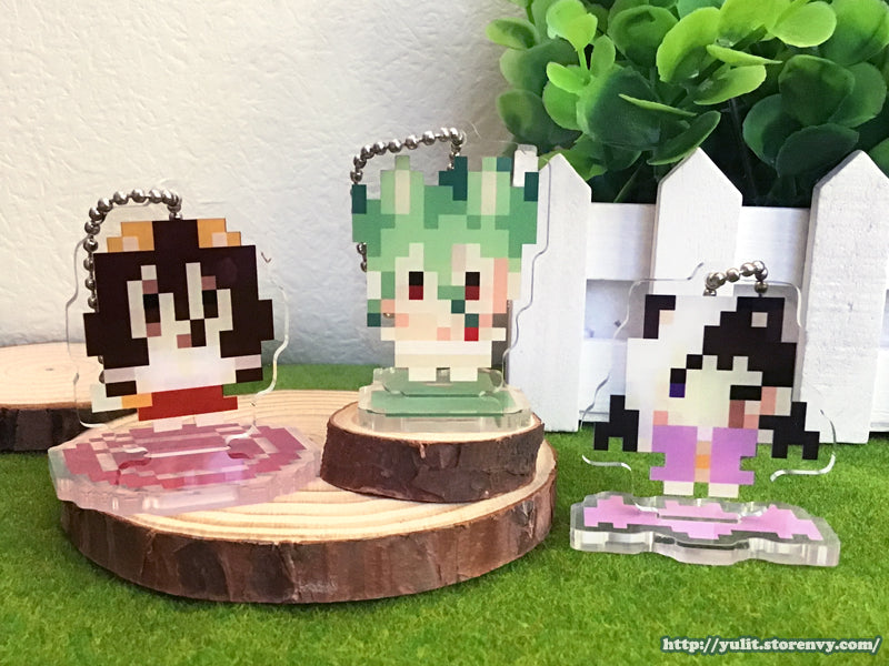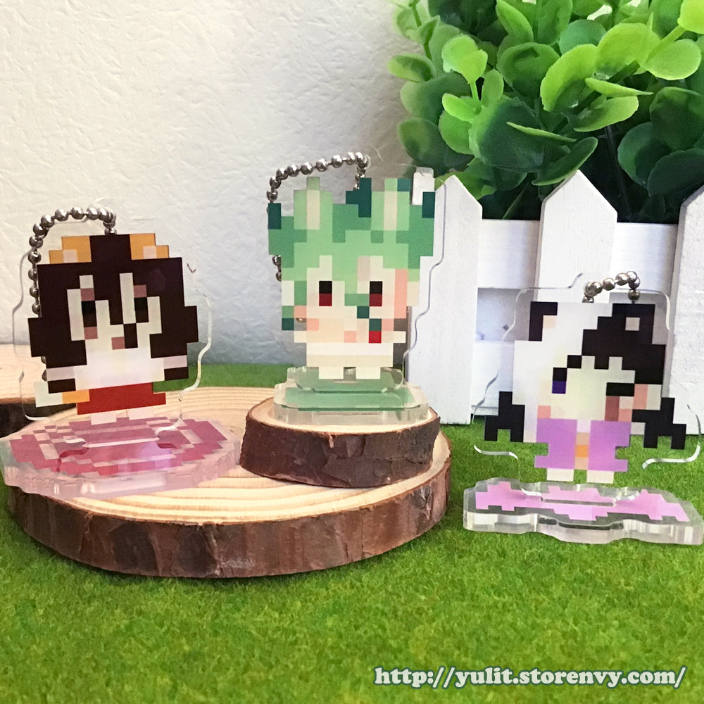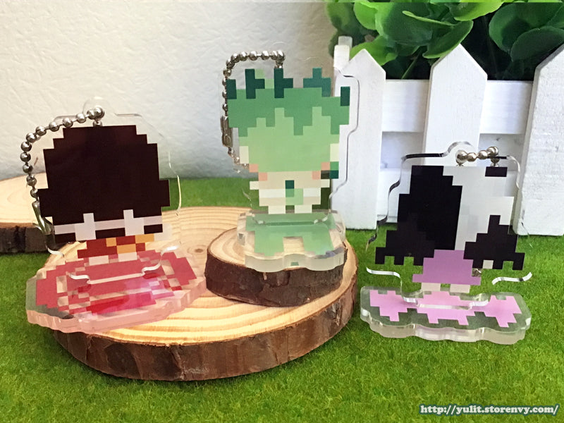 High gloss acrylic stand featuring animal Senku, Tsukasa, and Gen in pixel art style.