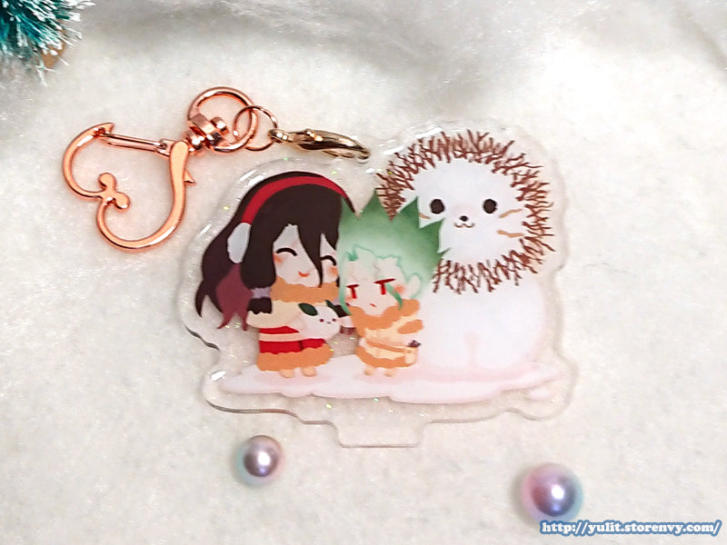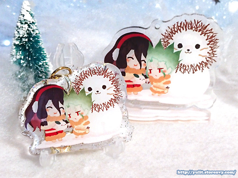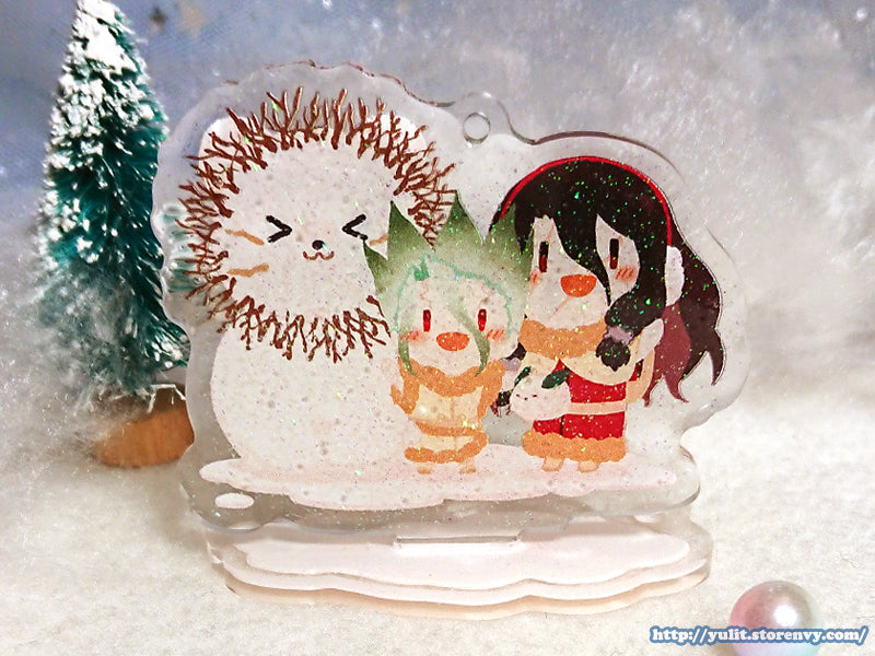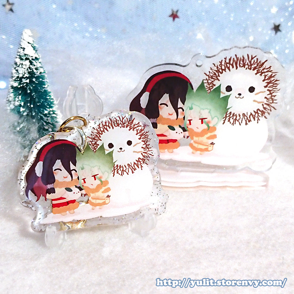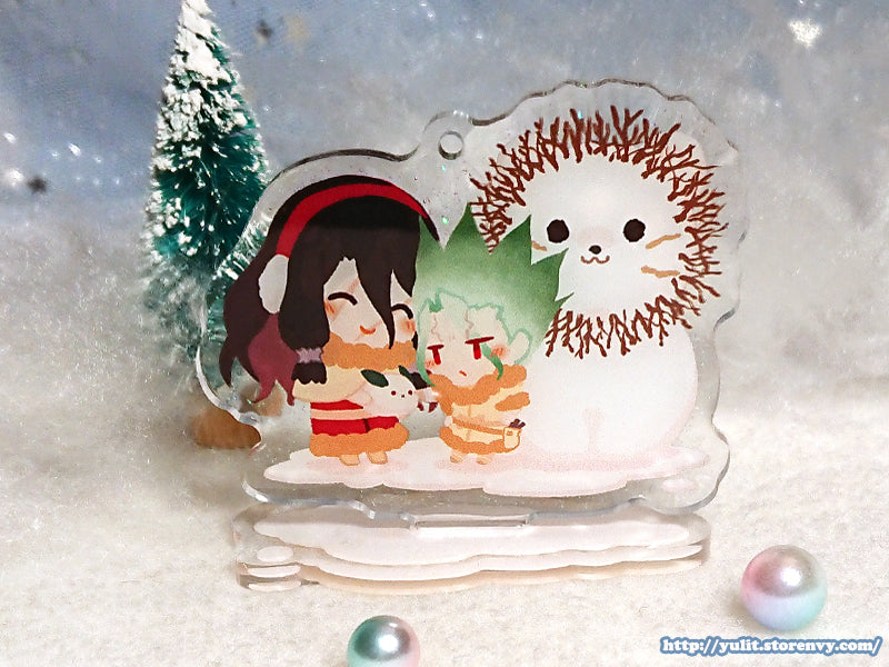 High gloss acrylic stand featuring Senku & Tsukasa in snow with glittering snow.