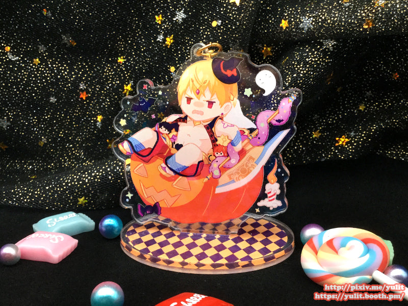 High gloss acrylic keychain standee featuring Wise King Gilgamesh in pumpkin basket!
