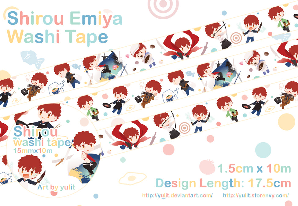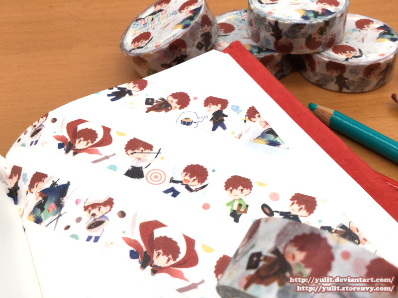 Professionally printed Washi Tape featuring 9 different chibi images of Shirou Emiya from Fate Stay/Night (as well as FGO as Projection Magic and Limited/Zero Over)!