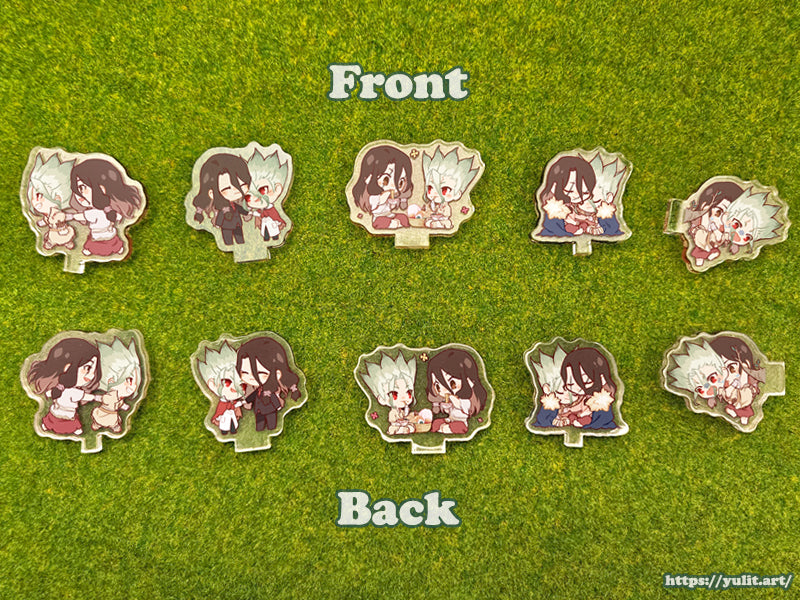 High gloss acrylic standee featuring 5 pairs of mini Tsukasa's and Senku's!