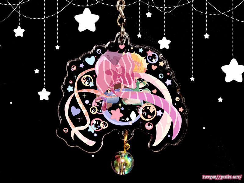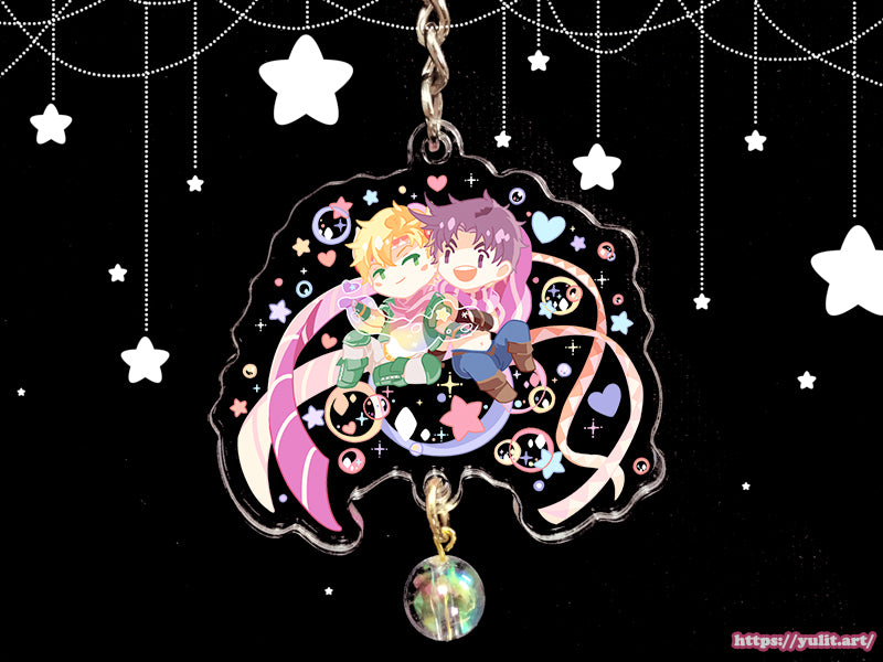 Double-sided clear acrylic keychain featuring Caesar x Joseph from JJBA, presented with holographic bead resembling Caesar's bubble.